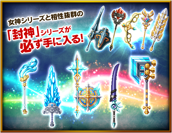 お知らせ 2015年09月29日(火) 究極確率アップ!「封神シリーズ確定ガチャ」販売開始のお知らせ 販売期間 2015/9/29(火)メンテナンス後~9/30(水)23:59まで ※予定 内容 必殺スキル使用時に得意属性の「神獣」、「化身」に対して有利な効果を得られる「封神シリーズ」が必ず手に入る! さらに今だけ究極確率アップ!このチャンスを見逃すな! ※「封神シリーズ」の詳細はこちらをご確認ください。 ※「封神シリーズ確定ガチャ」からは各ジョブの魔晶石ガチャより高い確率で「究極装備」が手に入ります。 リスト