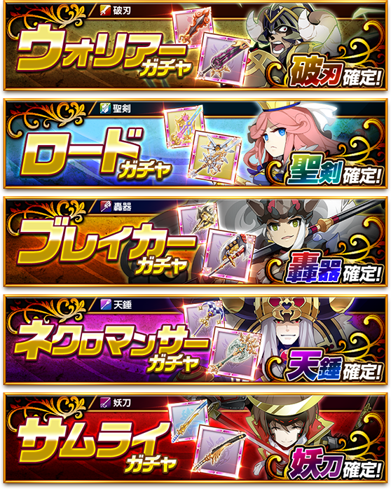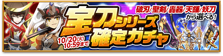 お知らせ 2015年10月14日(水) 「宝刀シリーズ確定ガチャ」販売開始のお知らせ 販売期間 2015/10/14(水)メンテナンス後~10/20(火)10:59まで ※予定 内容 宝刀シリーズが必ず手に入る! 破刃、聖剣、轟器、天錘、妖刀の中から欲しい武器種を選んで手に入れよう! ※「宝刀シリーズ」の詳細はこちらをご確認ください。 ※ガチャラインナップはこちらをご確認ください。 リスト