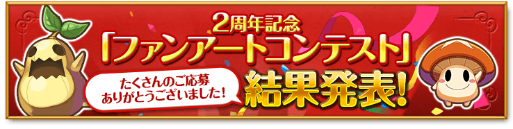お知らせ 2016年02月09日(火) 2周年記念「ファンアートコンテスト」結果発表のお知らせ 2015/12/8(火)~2016/1/12(火)まで実施しておりました、2周年記念「ファンアートコンテスト」の結果を発表いたします。 『最優秀賞』をはじめ、プロデューサー特別賞『しもへー賞』の他、『チェリー賞』『ディレクター賞』など、多数の応募から選ばれた受賞作品をぜひご覧ください! 気になる結果発表はこちら! ※「ファンアートコンテスト」の詳細はこちらからご確認ください。 リスト