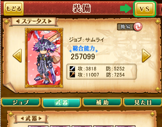 「VS」画面へは「メニュー」⇒「装備」⇒「VS」より移動できます。