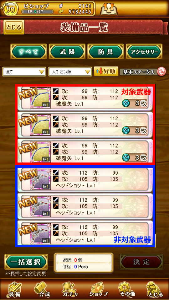 ゲーム内の「メニュー」>「装備」>「一覧」>「売却」にて、売却する武器の一覧を表示した際に、右下にメダルアイコンが出ているものが対象武器となります。