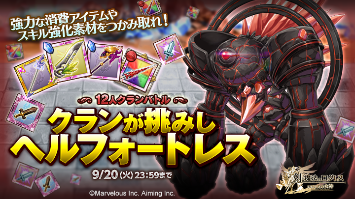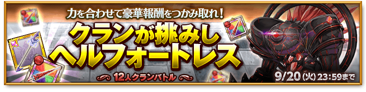 お知らせ 2016年09月06日(火) 【クランイベント】みんなで豪華報酬を手に入れろ!「クランが挑みしヘルフォートレス」開催! 内容 期間中、クランクエストにて「クランが挑みしヘルフォートレス」と「ヘルフォートレスの帰還」を配信します。 超高難易度の限定クエストにクランで挑み、豪華報酬をつかみ取れ! 報酬 「オシリス」や「ダークオシリス」の効果を持つ強力な消費アイテムをはじめ、究極のスキル素材や進化素材などが手に入ります。 開催期間 2016/9/6(火)メンテナンス後~9/20(火)23:59まで ※メンテナンス日程および開催期間、内容は変更となる場合があります。 リスト