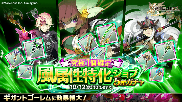 ギガントゴーレム討伐応援!「風属性特化ジョブ5連ガチャ」販売