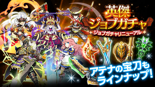 「ジョブガチャ」の販売を終了し、新たに「英傑ジョブガチャ」及び「究極確定武器ガチャ」を販売します。