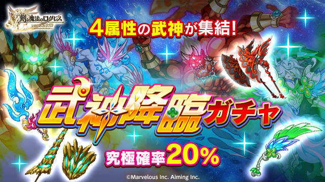 「魔神器」など強力な武器が火・水・土・風の各属性ごとにラインナップされている「武神降臨ガチャ」を販売します。