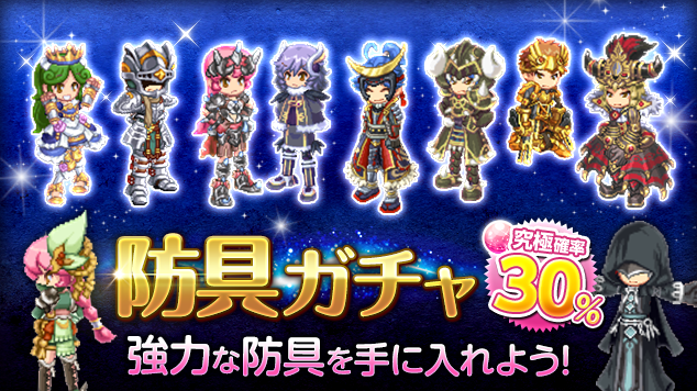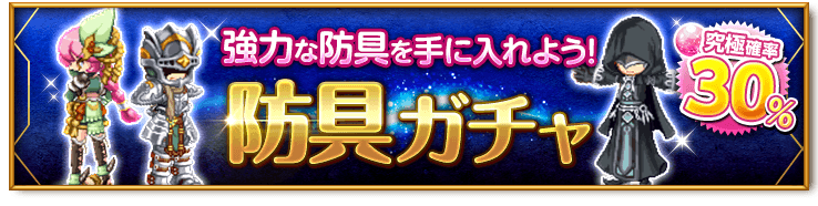 ラインナップが強力な防具のみに厳選され、究極確率が高くなった「防具ガチャ」を販売します。