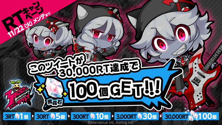 ログレス3周年を記念し、リツイート数に応じて全キャラクターに最大100個の魔晶石をプレゼントする「リツイートキャンペーン」を実施します。