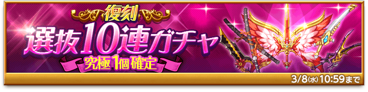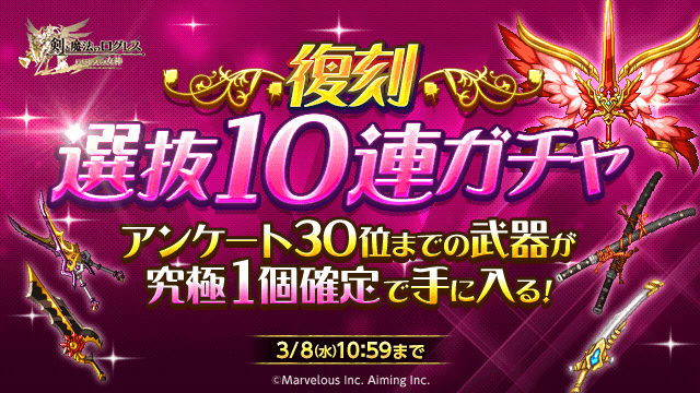 「選抜ガチャアンケート」にて上位50位に選ばれた武器のみが手に入る「選抜10連ガチャ」を復刻販売します。