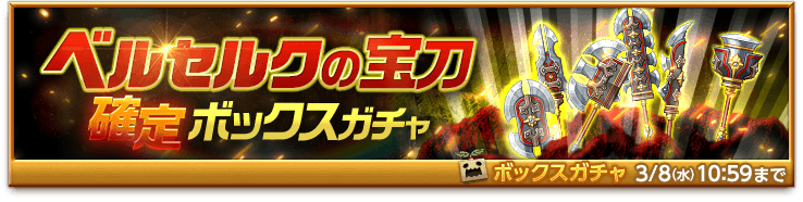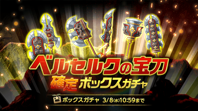 各武器種のベルセルクの宝刀が確定で手に入る「ベルセルクの宝刀ボックスガチャ」を販売します。