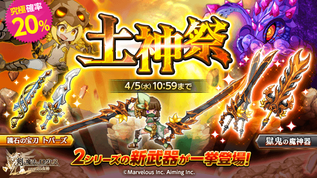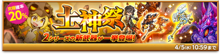 数ある武器の中で随一のダメージリミットを誇る「獄鬼の魔神器シリーズ」と、状態異常「封印」に耐性を持つ護石の宝刀「トパーズシリーズ」が追加された「土神祭ガチャ」を販売します。