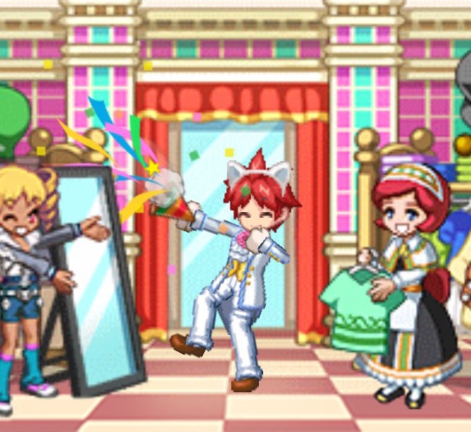 タイトルにある「パーティ風」なイメージが服装以外のオブジェクトも含めてよく演出されていると思いました。背景やオブジェの色が賑やかなので衣装を落ち着いた白でコーディネートできている点も◎。 |