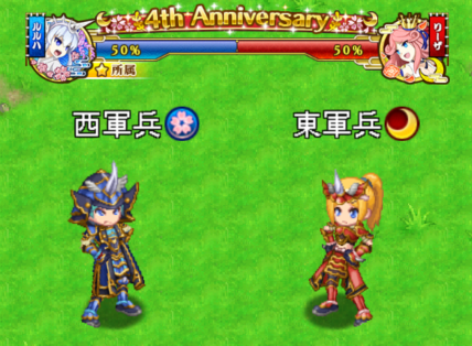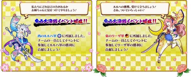 期間中にログインした全てのキャラクターは、自動的に東軍・西軍に振り分けられ、特定のクエストを遊ぶことで獲得できる「東西ポイント」の合計で勝敗を競う「東西大決戦」に参加することができます。