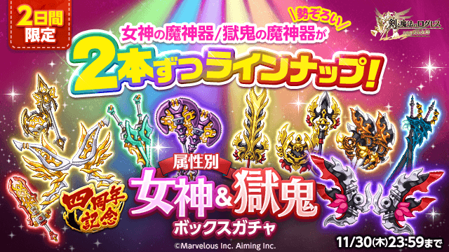 「女神の魔神器」「獄鬼の魔神器」が2本ずつラインナップされた属性別のボックスガチャは2日間限定!