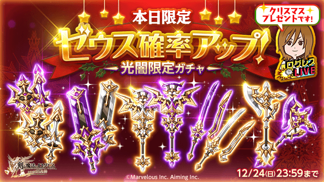 2017/12/21(木)放送の第14回「ログレスLIVE」にて、福田所長が約束したクリスマスプレゼントの内容は、12/24(日)限定販売ゼウス確率アップ「光闇限定ガチャ」に決定!