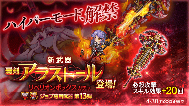 期間中、「デスペラード」「リベリオン」の新専用武器「覇剣アラストール」が手に入る「リベリオンボックスガチャ」を販売します。
