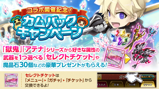 今ゲームに戻ってくると、究極レアリティの「獄鬼の魔神器」「アテナの宝刀」から好きな武器を1本選ぶことができる「アテナの宝刀・獄鬼の魔神器シリーズ チケット」など、豪華ギフトをプレゼント!