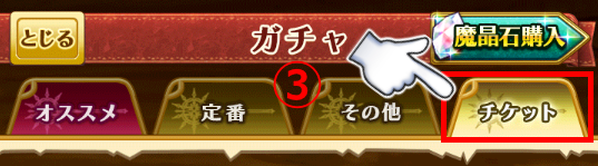 「アテナの宝刀・獄鬼の魔神器シリーズ チケット」は、①「メニュー」>②「ガチャ」>③「チケット」より使用することができます。