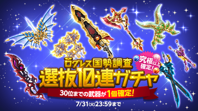 期間中、ガチャの「オススメ」タブにて「ログレス国勢調査 2018年上半期~武器編~」の総合人気ランキング90位までの武器のみが手に入る「ログレス国勢調査選抜10連ガチャ」を販売します。