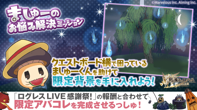 城下町のクエストボード横にいるましゅーくんに話しかけて正しい選択肢を選び、限定アバコレ用背景を手に入れよう!