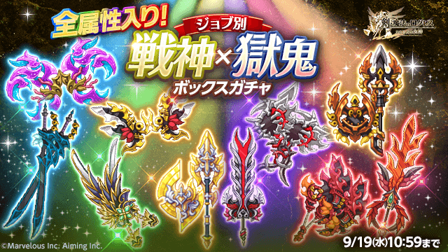 総数200のジョブ別のボックスガチャには、6属性の「戦神の魔神器」と、「獄鬼の魔神器」2本ずつがラインナップ!