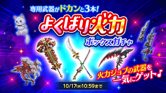 さらに、ピックアップのラインナップは各ジョブの専用武器に合わせ、火・水・闇特選!「戦神の魔神器」「ベオウルフ」「フェリス」シリーズなど、火力ジョブを一気にマスターできる武器が勢揃い!