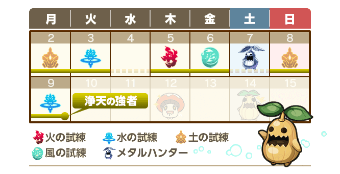 期間中「スペシャルクエスト」にボス討伐クエスト「水の試練」「火の試練」「風の試練」「土の試練」「メタルハンター」を、日替わりで定時配信いたします。