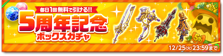 期間中、ガチャの「オススメ」タブにて、毎日1回無料で引ける「5周年記念ボックスガチャ」を販売します。
