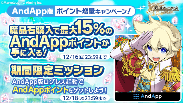 AndApp版「剣と魔法のログレス いにしえの女神」にて直接支払いで「魔晶石」を購入すると、通常2%還元のAndAppポイントが最大15%還元に増量!