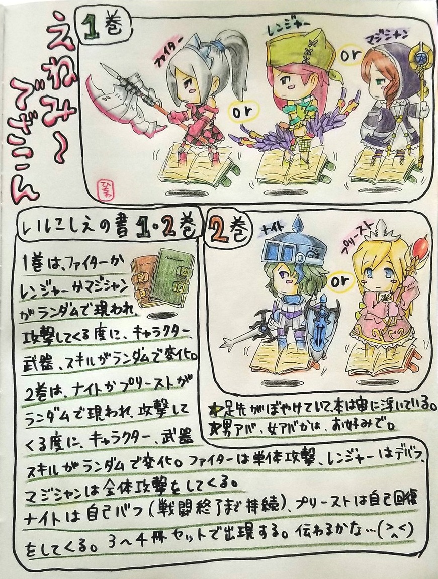 作品名 いにしえの書1巻・2巻 作者名 ひちゃぷぅ。@ログレスw1(@hityapuu2)様 意気込み レベル上げでしか使わない基本職や、昔懐かしい武器を使って欲しくて、描きました♪ No ③
