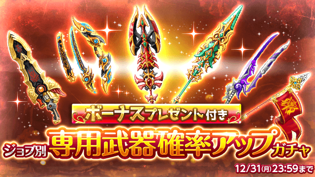 期間中、ガチャの「オススメ」タブにてジョブ別の「専用武器確率アップガチャ」を販売します。