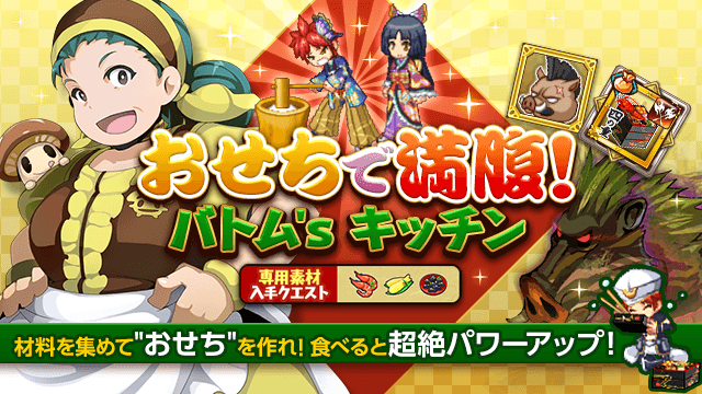 材料を集めて、バトムに特製”おせち”を作ってもらおう!おせちを食べると超絶パワーアップ!普段苦戦する強敵を、このイベントで楽々討伐だ!