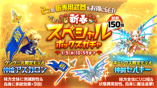 期間中、ガチャの「オススメ」タブにて「神槍アスカロン 新春スペシャルボックスガチャ」と「神剣セルキー 新春スペシャルボックスガチャ」を販売します。