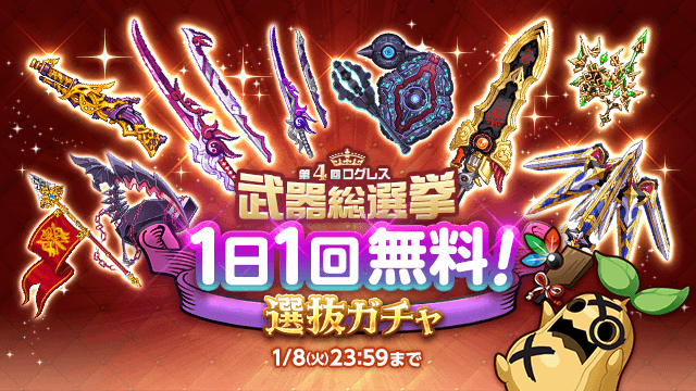 期間中、ガチャの「オススメ」タブにて「第4回ログレス武器総選挙」で上位100位に選ばれた武器のみが手に入る「選抜10連ガチャ」を販売します。