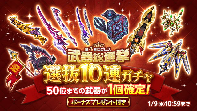 さらに今回の選抜10連はガチャボーナスプレゼント付き!「第4回ログレス武器総選挙」で1位から50位に選ばれた好きな武器から1つを選んで交換できる「第4回 ログレス武器総選挙 チケット」もラインナップ!