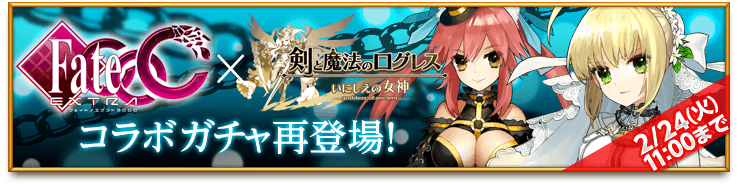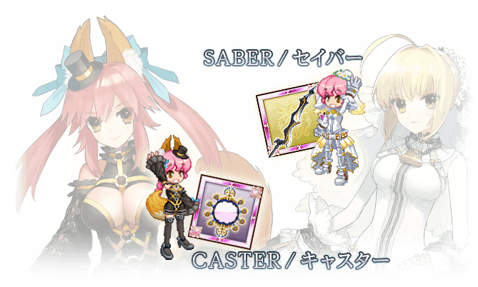 大人気RPG「フェイト/エクストラCCC」の登場するキャラクター「セイバー」「キャスター」の武器と防具が期間限定で手に入ります。セイバー装備は光属性、キャスター装備は闇属性が必ず手に入ります。