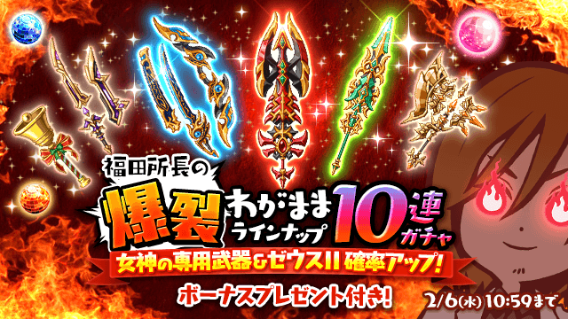 ボーナス付き★女神の専用武器&ゼウスⅡ確率アップ「福田所長の爆裂わがままラインナップ10連ガチャ」販売!