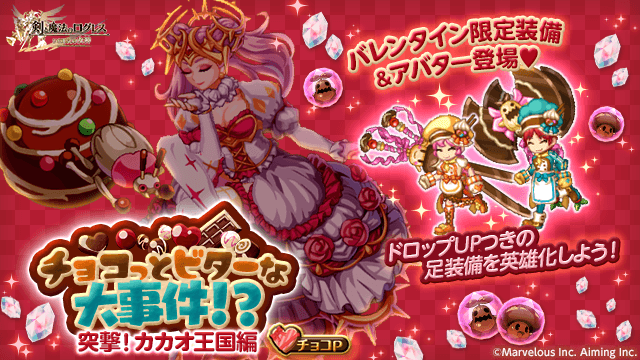 期間中、「ログレス」タブのスペシャルクエストおよび時限イベントにて「チョコっとビターな大事件!?~突撃!カカオ王国編~」を開催します。