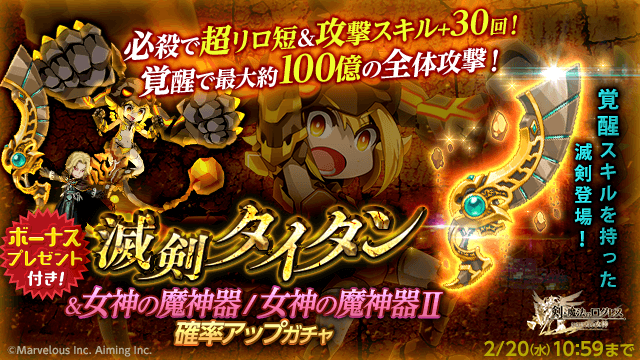 今回のガチャボーナスプレゼントでは、新登場「滅剣タイタン」などの滅剣の他、「女神の魔神器Ⅱ」「女神の魔神器」から好きな属性の魔剣を選べるチケットが登場!