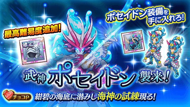 今回から最高難易度のクエスト「決戦、極・超越武神ポセイドン」が登場!見事クリアしたあかつきには「究極 アクセサリースキル確定素材(水)」が手に入ります。