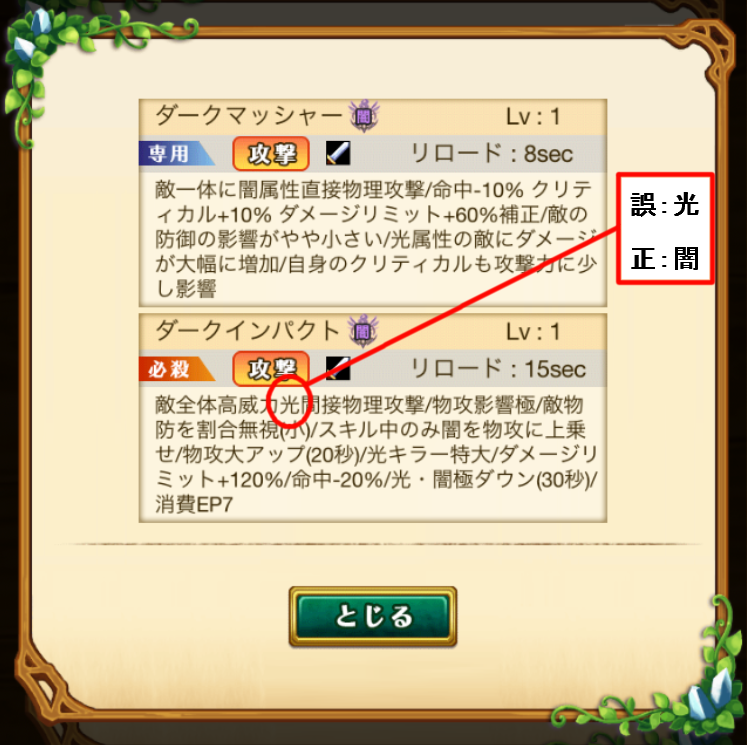究極 十字世の撃鎚の必殺スキル「ダークインパクト」の説明文に一部誤りがある。