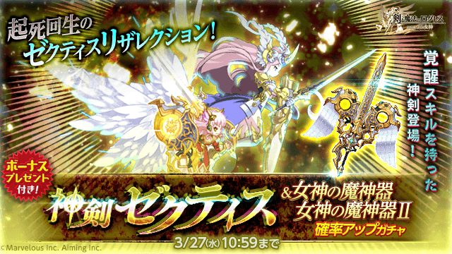 今回のガチャボーナスプレゼントでは、新登場「神剣ゼクティス」などの神剣の他、「女神の魔神器Ⅱ」「女神の魔神器」から好きな属性の天翼を選べるチケットが登場!
