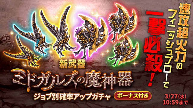 期間中、ガチャの「オススメ」タブにて新武器「ミドガルズの魔神器」が手に入る「ミドガルズの魔神器 確率アップ デスペラードガチャ」「ミドガルズの魔神器 確率アップ アサシンガチャ」を販売します。