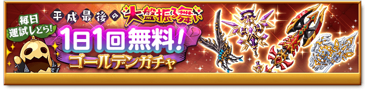 1日1回無料ガチャやスキルレベル上昇確率最大15倍など!「平成最後の大盤振る舞いキャンペーン」