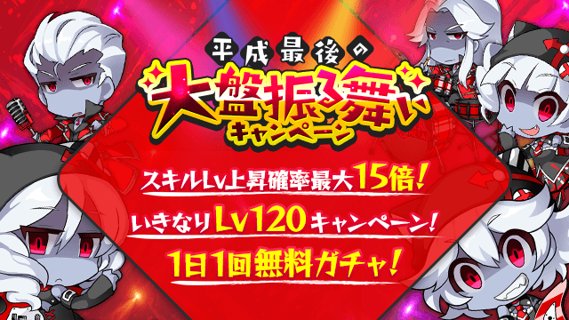 ●1日1回無料ガチャやスキルレベル上昇確率最大15倍など!「平成最後の大盤振る舞いキャンペーン」
