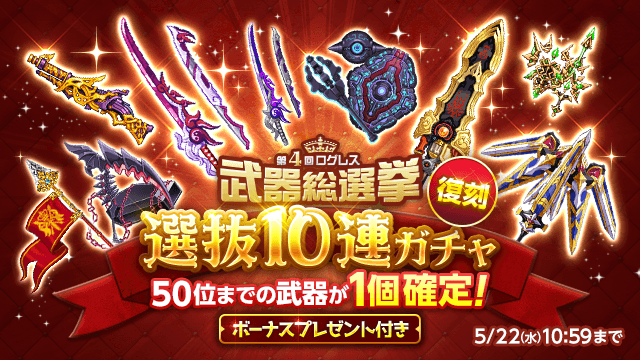 期間中、ガチャの「オススメ」タブにて「第4回ログレス武器総選挙」で上位100位に選ばれた武器のみが手に入る「選抜10連ガチャ」を復刻販売します。