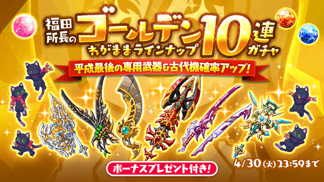 ●平成最後は専用武器&古代機が確率アップ!「福田所長のゴールデンわがままラインナップ10連ガチャ」
