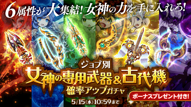 6属性が大集結!「ジョブ別 女神の専用武器&古代機確率アップガチャ」