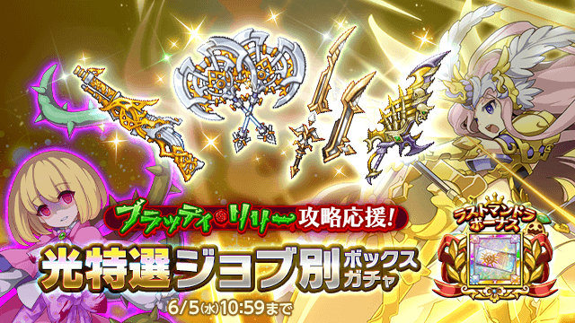 期間中、ガチャの「オススメ」タブにてブラッディリリー攻略応援として「光特選 ジョブ別ボックスガチャ」を販売します。