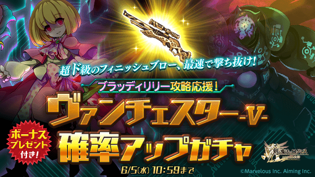 期間中、ガチャの「オススメ」タブにてブラッディリリー攻略応援として「魔銃ヴァンチェスター-Ⅴ-確率アップガチャ」を販売します。