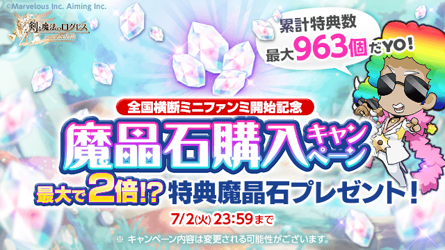 「全国横断ミニファンミ」の第1回開催を記念し、期間中の魔晶石購入金額の合計が特定金額に達するごとに、追加で魔晶石をプレゼント!